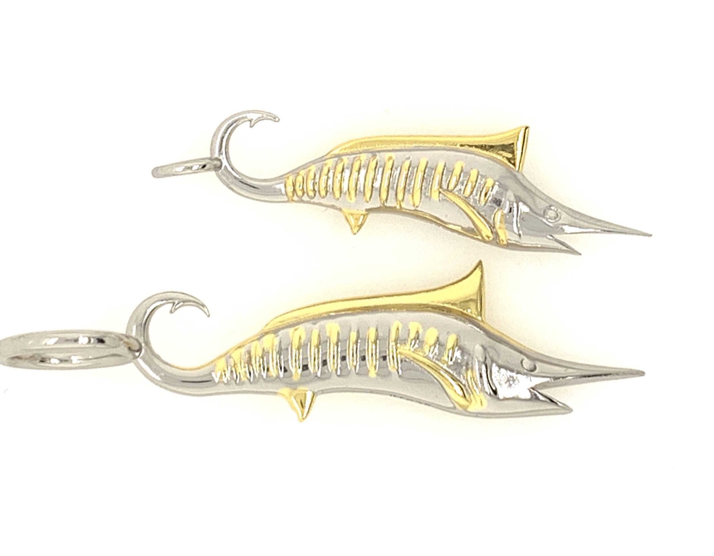 Small: Measuring 1 1/4″ in length and 3/8″ wide, this two sided Marlin is 4.2 grams of Sterling Silver with 10 kt gold white and yellow gold plating.